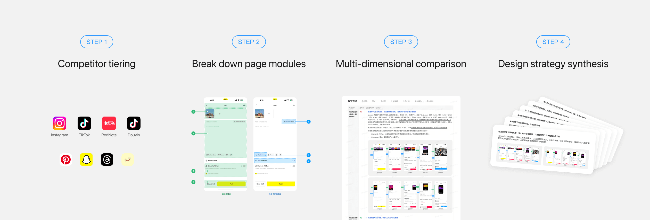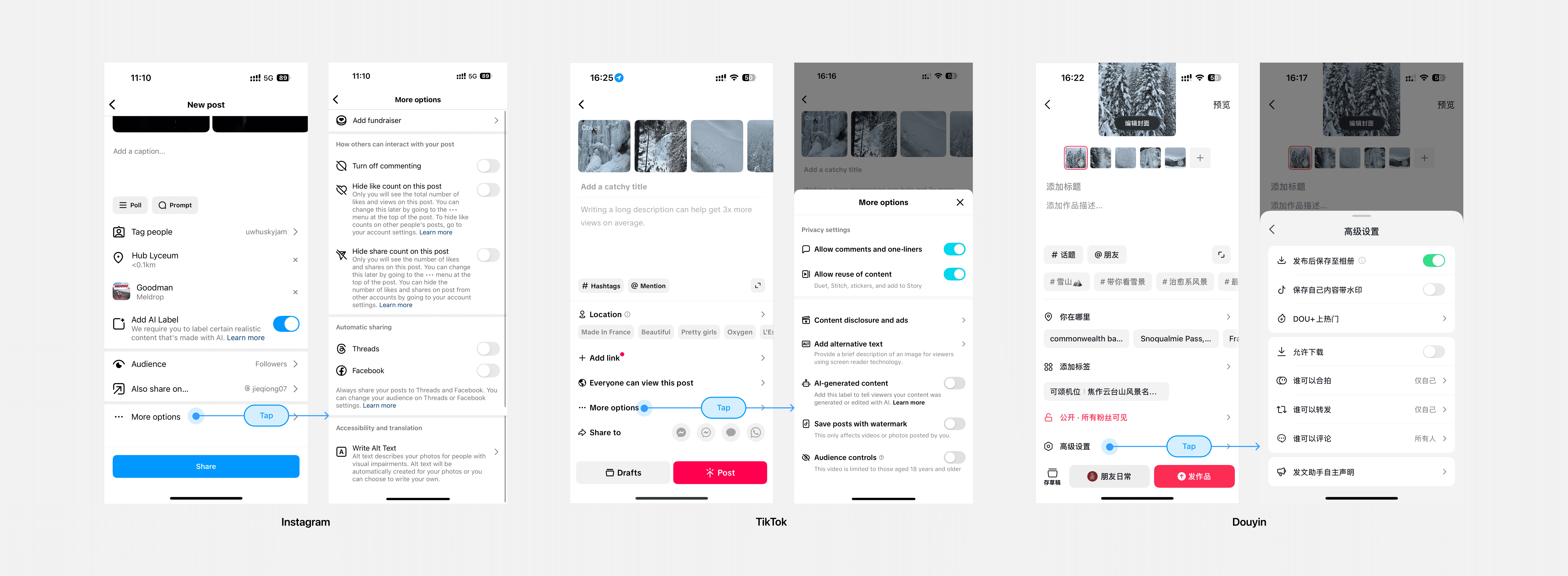 Competitors have much more post setting functions than Lemon8. They generally expose core/high-penetration functions and hide secondary/low-penetration functions to maintain page support complex functionality. Lemon8 has only three post setting functions, yet they are rather complex and inconsistent in styles, leaving no room for future functions.