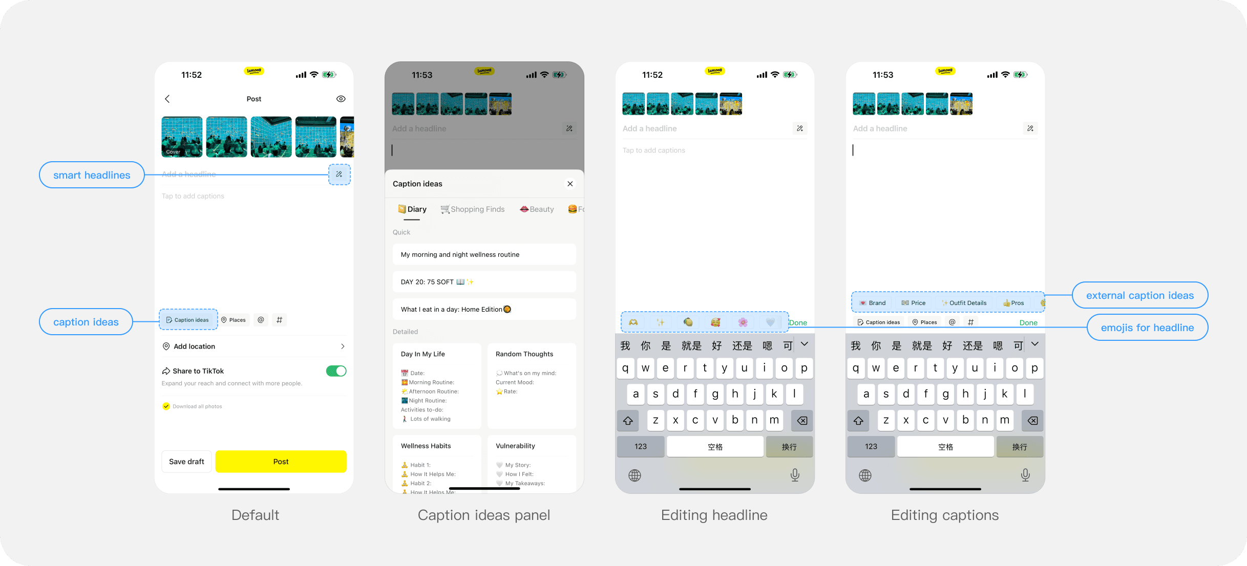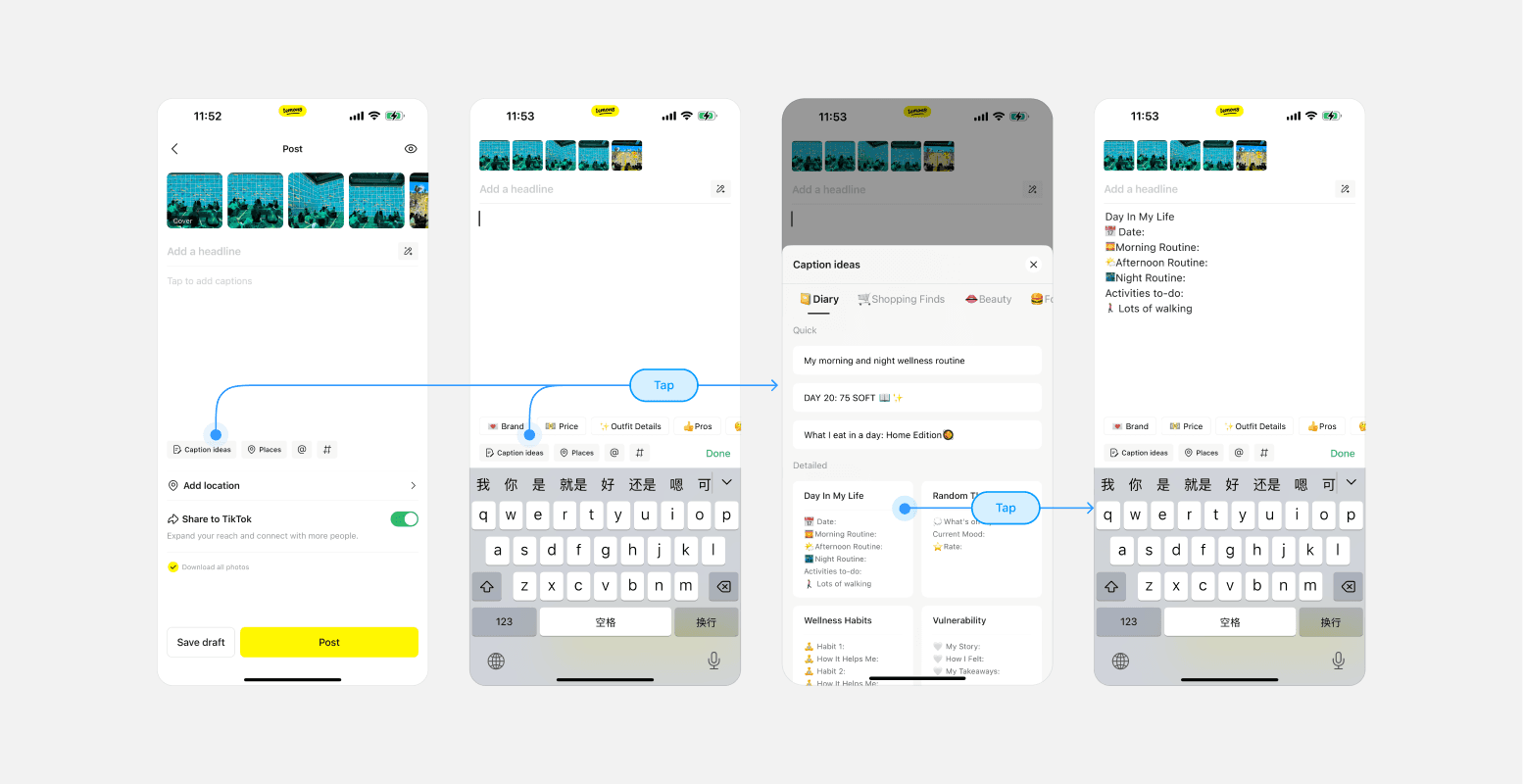For captions, the caption ideas function has complex interaction flows, low usage and poor match with post contents. Therefore, we removed this function and displayed other caption editing functions in a cleaner way.