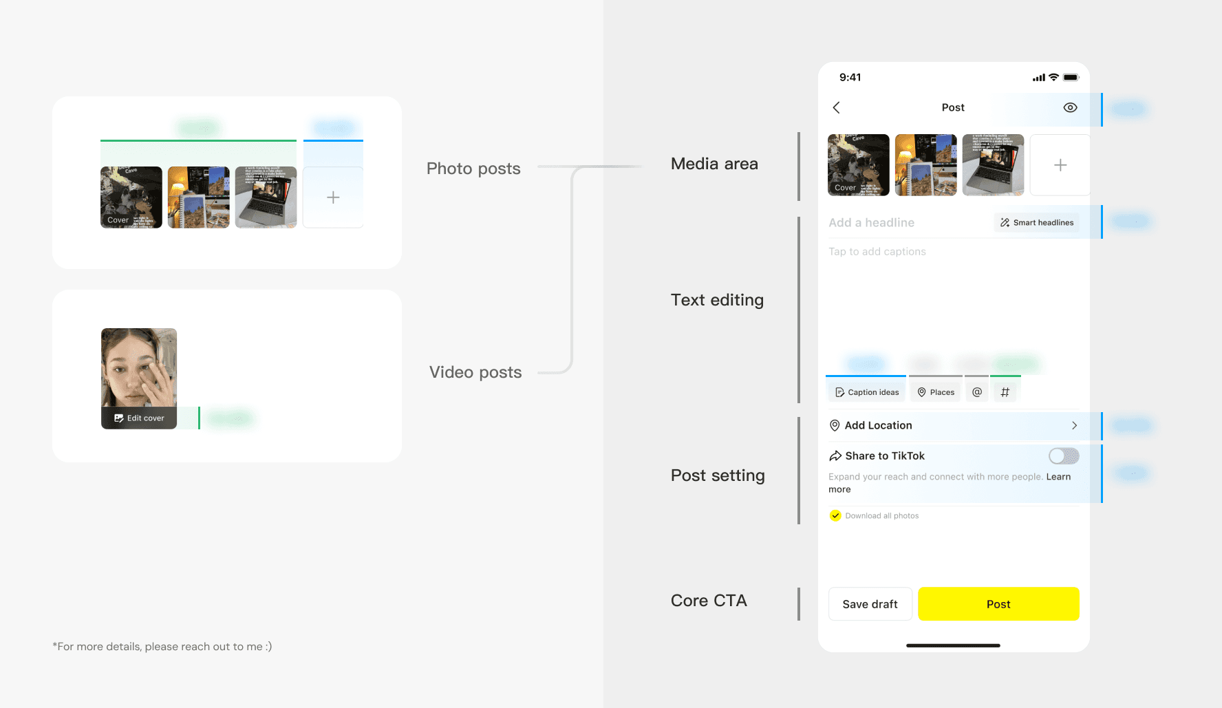 We reached consensus with PM to shift the role of post page from "complex content editing stage" to "the final step in perfecting content," highlighting the media area as primary where users have already finished editing and put text area as secondary.